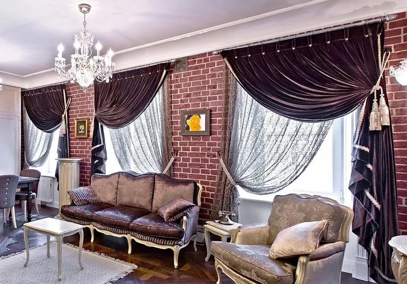 Если дизайн лофт сочетается с неоклассикой, то шторы лучше выбирать плотные с велюровой фактурой. В качестве дневных занавесок стараются использовать темные тюли с рисунком. Чтобы портьеры выполняли свою функцию, их на ночь опускают. Положение удобно регулируется с помощью декоративных шнурков с плетеными колокольчиками.