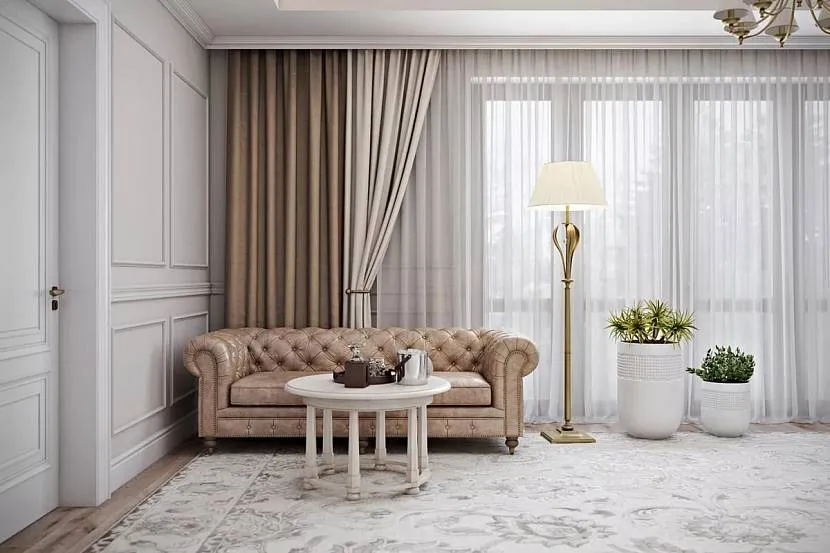 Занавески в стиле неоклассика обычно не дополнены никаким декором. Чаще это строгие модели длиною до пола. Это касается не только ночных портьер, но и привычного тюля.
