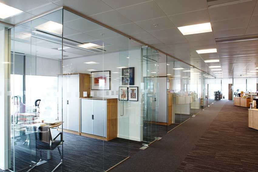 Стеклянные перегородки подойдут для зонирования офисов, когда необходимо создать несколько индивидуальных рабочих мест