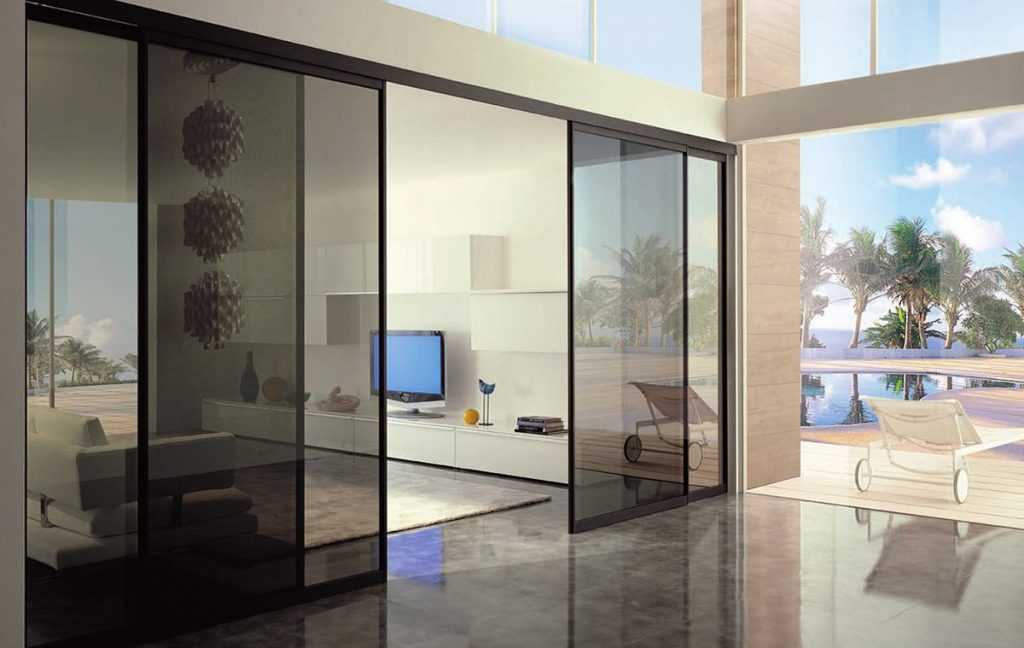 Выделяют две системы установки безрамного остекления: раздвижную и подвесную. Раздвижные перегородки из стекла широко используются для зонирования офисов. Створки перегородки двигаются параллельно, по рельсам. Чаще всего используют трех- и пятистворчатые конструкции. Каждая из частей двигается по одной рельсе, благодаря чему они «упаковываются» друг за другом. Таким образом, пространство открывается на 75-80%. При этом створки компактно собраны по сторонам системы.