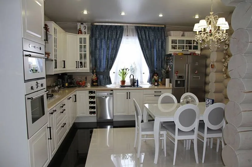 Синие занавески с белым рисунком хорошо оттенят белый кухонный гарнитур.