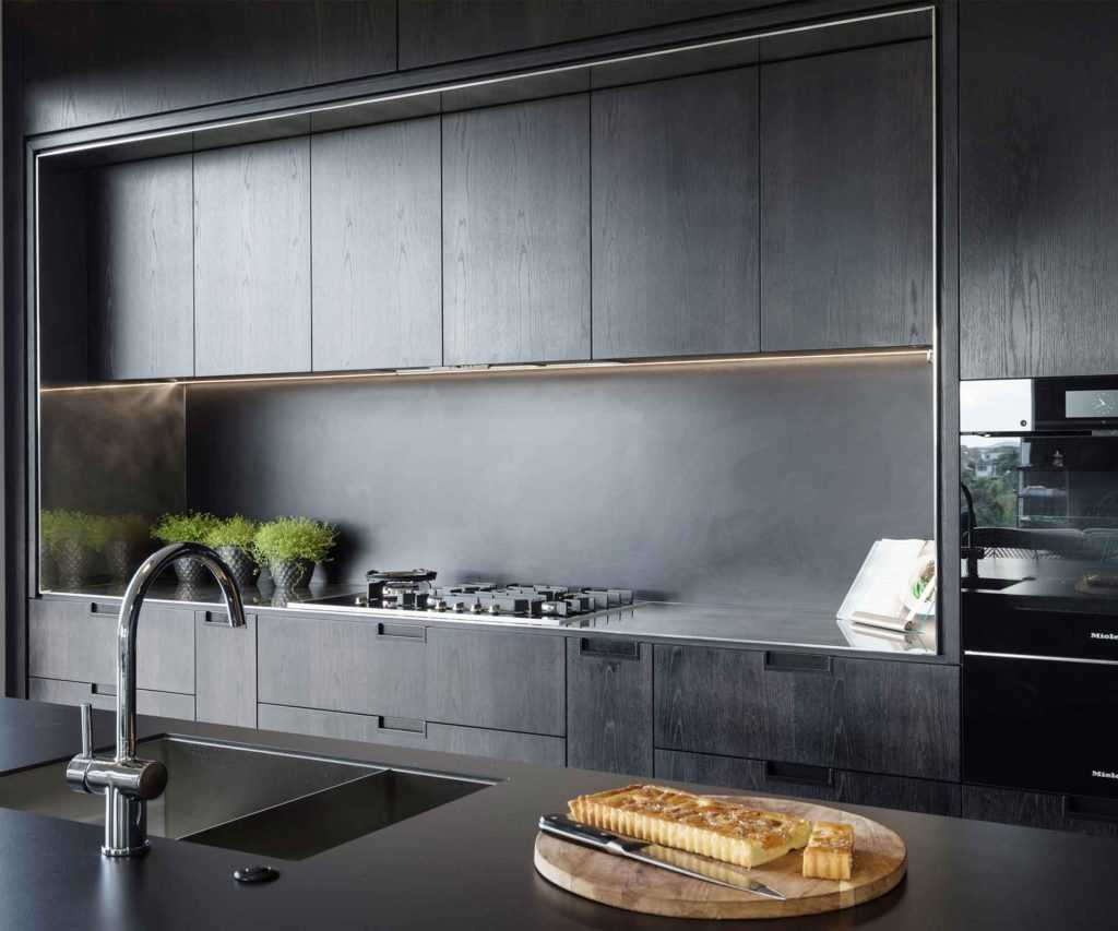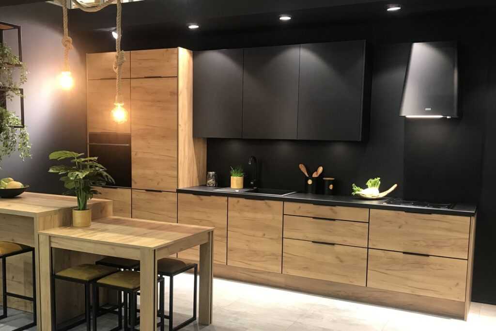 Для кухонь с черным кухонным гарнитуром, важно рассмотреть возможность использования яркого освещения, искусственного либо естественного, которые служат для контраста темноты кухонного гарнитура