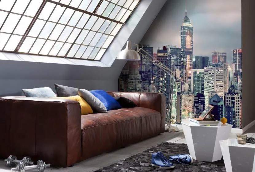 Фотообои в гостиной: урбанизация