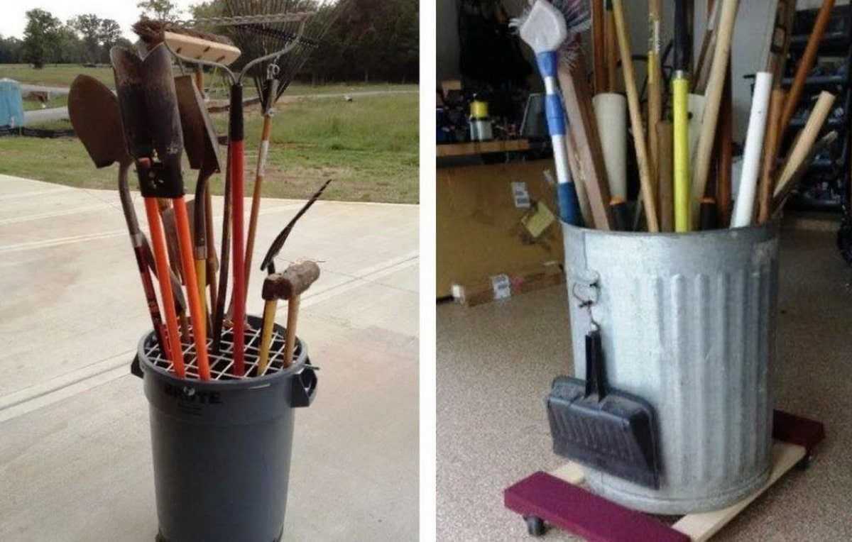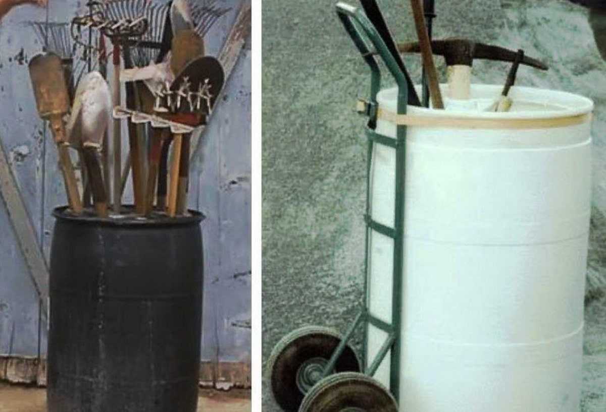 Интересные решения для хранения садового инвентаря можно придумать из мусорных бачков, а также бочек для воды. Это похоже на школьную подставку для авторучек. Но у них есть свои недостатки. Для устойчивости конструкции дно бочки нужно сделать более тяжелым, тогда она не упадет.