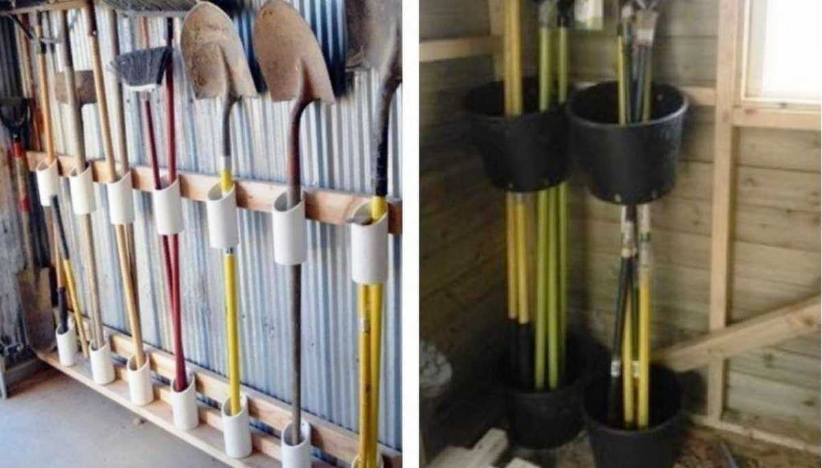 Это простая и быстрая идея. Надо взять старый шланг и зафиксировать его на стене. В получившиеся петли можно вставлять черенки лопат, граблей и тяпок. Такие петли лучше разместить в два ряда, чтобы инструмент хранился более устойчиво.