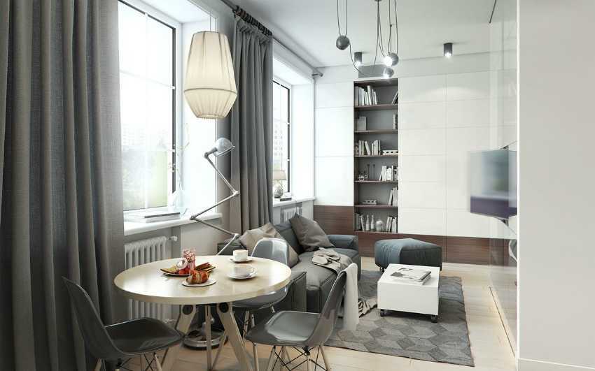 Небольшие помещения следует оформлять в светлых тонах. Исключением может стать использование темных оттенков на одной из акцентных стен. Такой дизайнерский секрет добавит дополнительной глубины помещению и приумножит свободное пространство, как видно на фото интерьера однокомнатной квартиры 20 кв.м.