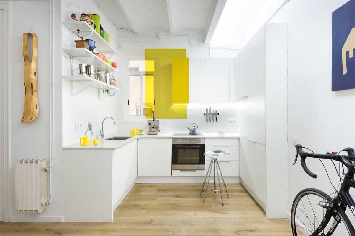 Не секрет, что в интерьере маленькой кухни, как нигде, уместно использование кранов, вентиляционных систем, мебельной фурнитуры, систем отопления, мелкой бытовой техники ярких кричащих цветов.
