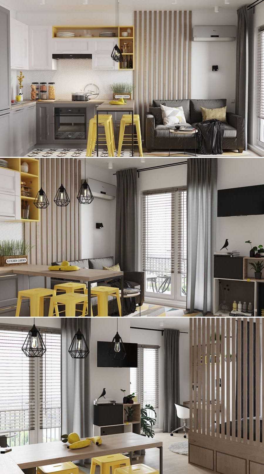 Оставьте идею с занавесками, используйте только световые завесы или вообще не применяйте их. Создав дизайн гостиной в небольшой квартире, вы можете полностью отказаться от занавесок, заменив их оригинальным декором или удобными жалюзи. Таким образом, вы позволите солнечному свету свободно проникать в маленькую квартиру-студию, заставляя ценить преимущества ее дизайна и, как результат, визуально увеличивать пределы помещений.