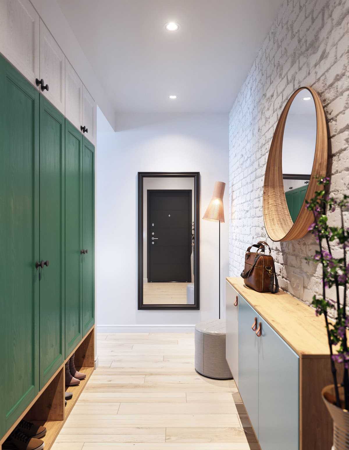 При входе поставили скамью, над ней расположили зеркало и вешалки для одежды. На скамье можно с удобством переобуться, а под ней – хранить обувь. Тут же располагается основная система хранения переменной ширины, часть ее отдана под одежду, часть – под бытовую технику.