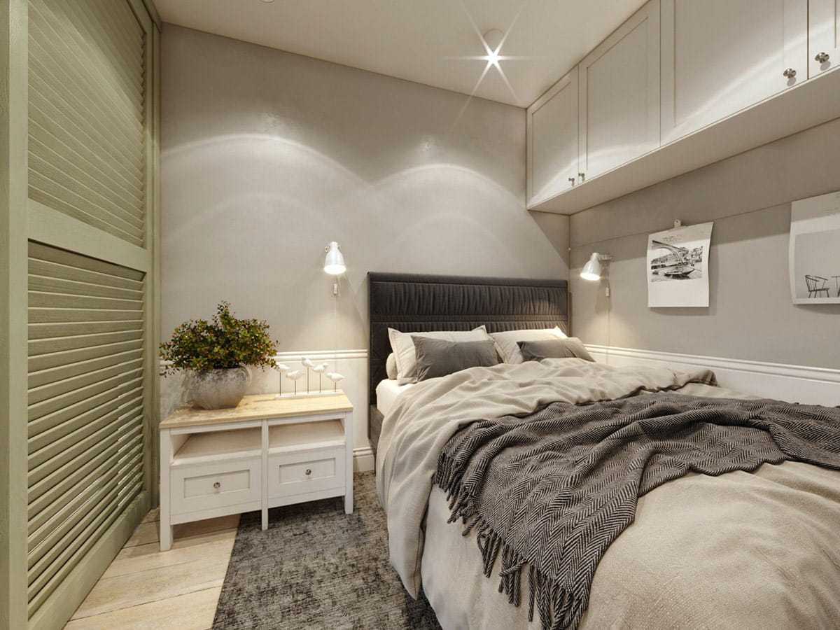 Разнообразить интерьер и создать настоящий уют в спальне можно с помощью освещения: бра, торшеры, настольные лампы будут уместны в этом помещении, а вот от массивных люстр лучше избавиться. Зеркала и отражающие поверхности тоже не лучшее решение в интерьере спальной комнаты с маленькой площадью.