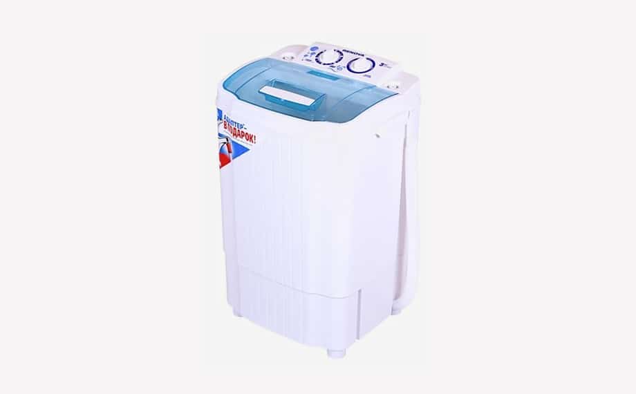Отдельно стоящая вертикальная стиральная машина с механическим управлением. Всего вмещает до 7 кг белья, чего более чем достаточно для стандартной стирки в дачных условиях. Функции сушки не предусмотрено, однако есть неплохой отжим, делающий вещи чуть влажными. Конструкция в белом корпусе весит около 18.5 кг и может устанавливаться в любом удобном месте. Доступны режимы обычной стирки и бережной стирки. Производитель предоставляет гарантию на один год, однако по документам аппарат должен прослужить не менее пяти лет.