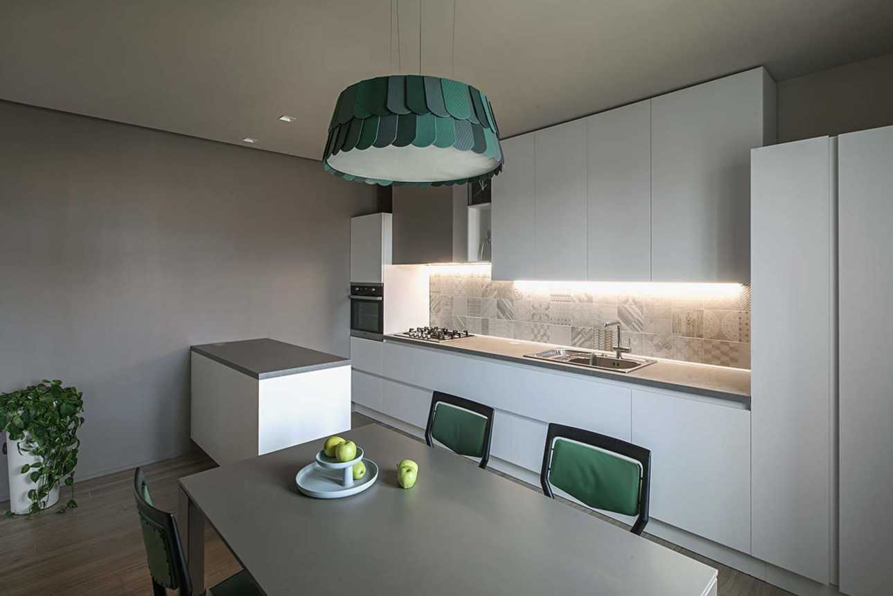 На фото современная белая кухня с комбинированным освещением: роль местной подсветки играют люминесцентные лампы, а центральный свет реализуется с помощью встроенных потолочных светильников.