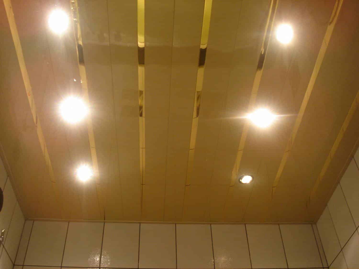 Потолок, оформленный в традиционном стиле с белым глянцевым или матовым покрытием, обычно не дает нужного эффекта большого пространства. Другое дело, если в оформлении используется подвесная система из металлических конструкций, использующая чередование глянцевых полированных и анодированных под золото или серебро планок. Интересное само по себе решение металлического потолка сделает ванную комнату более изысканной и впечатляющей.