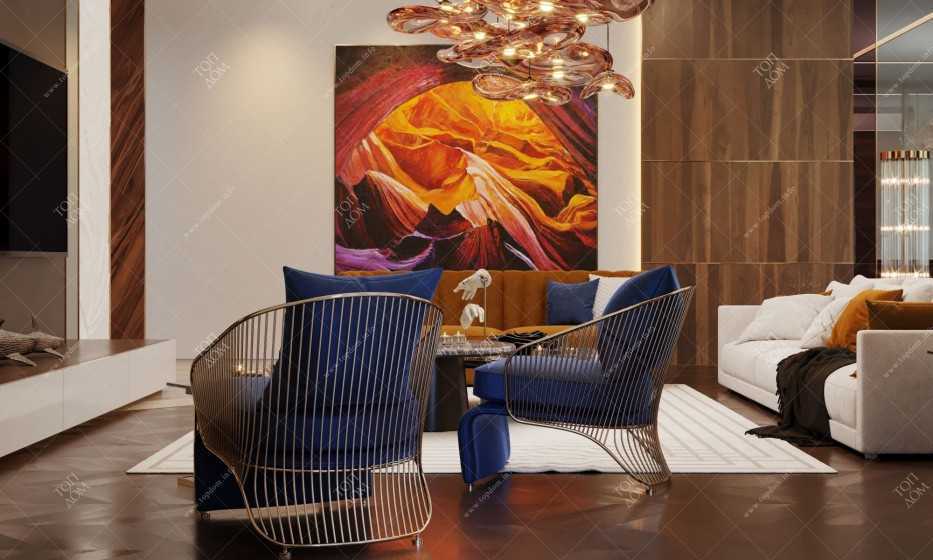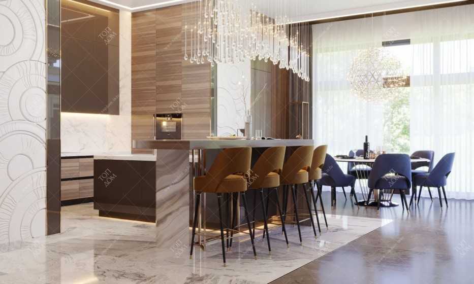 Разработанный под ключ современный двухэтажный дом получил не только привлекательный экстерьер, но и интерьерное оформление в том же ключе. Нарядная бело-коричневая палитра дерева, мрамора и штукатурки создает удачный фон для насыщенных акцентов – синих, горничных, оранжевых, изумрудных.