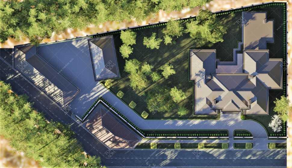 Дом общей площадью 700 кв. м имеет пропорциональную Г-образную планировку – это позволяет привязать его к сложному трапециевидному участку, при этом оставить свободное место для ландшафтного оформления и оборудовать удобные подъездные пути к жилому зданию и гаражу.
