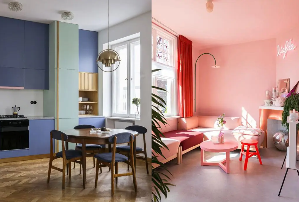 Мода на колор-блокинг тоже эволюционирует. Если в прошлом году в роли цветовых пятен выступали в основном геометрические фигуры на стенах и мягкая мебель, сегодня насыщенные оттенки всё чаще примеряют стулья, столы и фасады корпусной мебели.