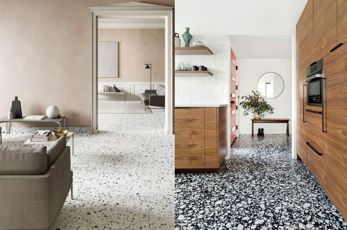 Если кухня в вашем жилом пространстве присутствует не только номинально, но и используется по прямому назначению, напольное покрытие стоит выбирать износостойкое и терпимое к влаге. На эту роль хорошо подходит практичный кварц-винил, но керамогранит в жилых комнатах — тоже не новость и более того — модный тренд.