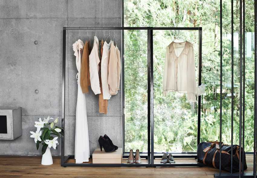 Если имеется ниша, то можно установить в прихожую лофт шкаф-купе, но двери должны быть сдвижными и желательно зеркальными. Такой шкаф не только не уменьшит пространство, но и за счет зеркала визуально его расширит. Если не хочется заполнять свободное место шкафом, вместо него можно просто установить стеллаж с открытыми полками, на которых хранят картонные коробки с какими-либо вещами или обувью.