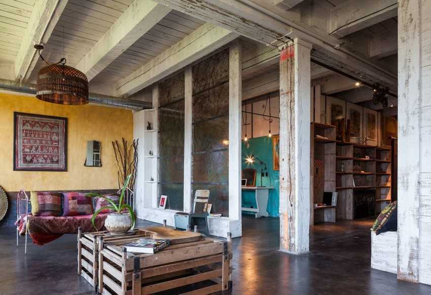 - На потолке располагаются балки, перекрытия, роскошные люстры или студийные лампы (снова принцип контраста).