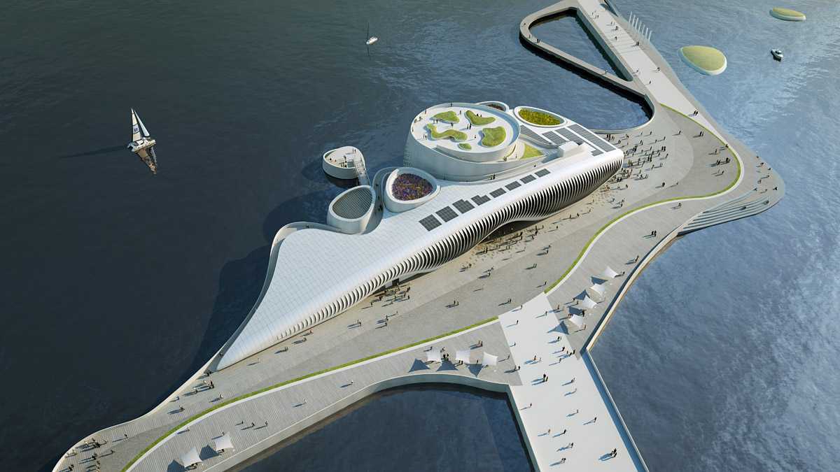 Гигантское белоснежное здание, расположившееся на искусственной платформе в заливе у побережья, очертаниями напоминает одновременно глубоководного обитателя и океанскую волну. Само расположение и формы комплекса должны гармонично вписываться в изменчивую водную стихию, продолжать и имитировать движение волн. В строительстве здания была использована революционная технология подвижного фасада, что добавило объекту буквальной динамики.