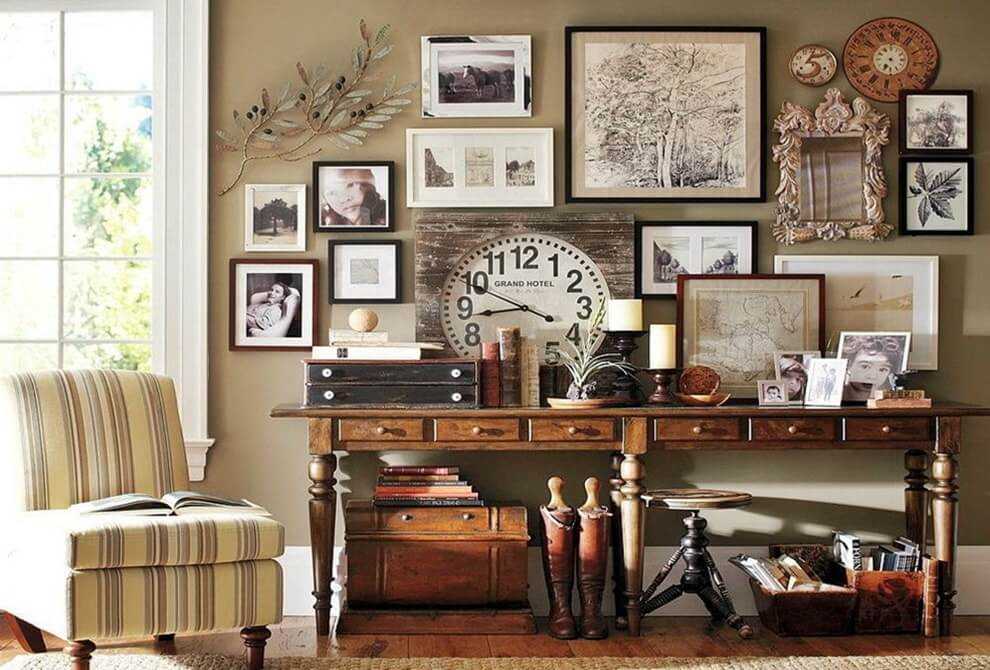 Весьма часто в гостиной можно найти чёрно-белые семейные фотографии, фигурирующие на бабушкином комоде. Однако фото в раме необязательно должны быть из личного фотоальбома. Главная их задача – возвращение былого времени и создание неповторимого уюта, свойственного именно этому дому. Кто будет изображён на фотографии – решать только хозяевам. Это может быть как семейная родословная, так и портрет Мэрилин Монро во весь рост – как на популярных плакатах прошлого века.