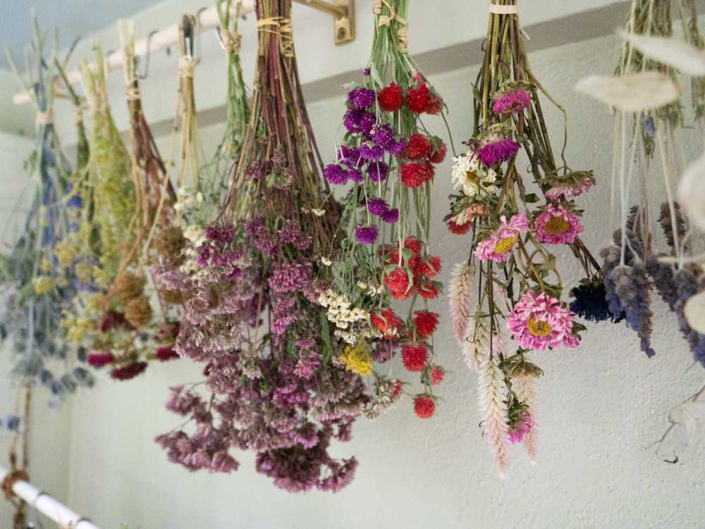 Как только сухоцветы немного «схватятся», лишняя влага уйдет, их переносят в помещение, чтобы ветер не сдувал уже повядшие лепестки.