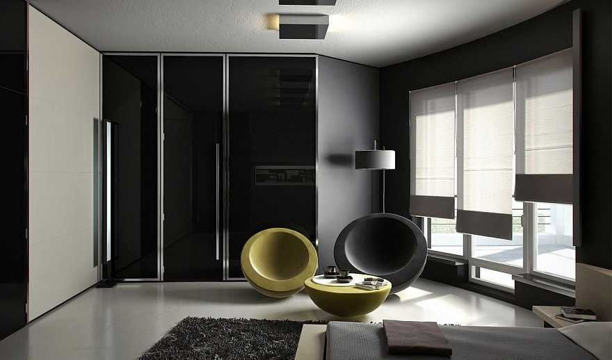 Чтобы гостиная не выглядела слишком темной, правильно выбираем сопутствующие цвета и обеспечиваем хорошее освещение. Черный ассоциируется с ночью, поэтому для оформления спальни то, что надо. Темный глянцевый потолок – очень эффектно! Органично будет выглядеть темная стена с красивым декором. В этом случае выбираем контрастные шторы. В темной спальне намного легче засыпать. Однако нужно соблюдать грань между темными, приглушенным интерьером и полным мраком.