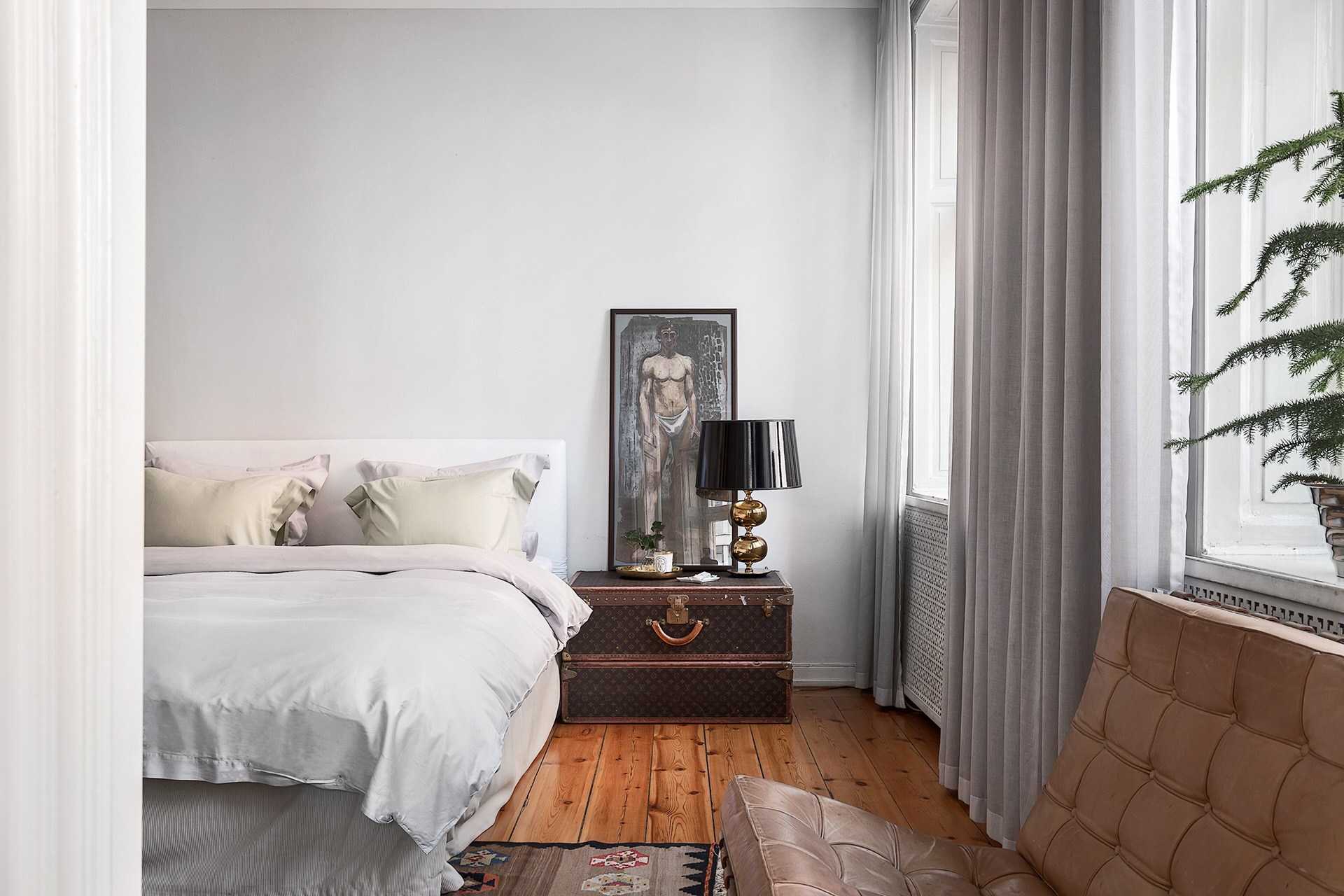 Скандинавская спальня ратует за минимализм – стандартный набор такой комнаты содержит в себе только шкаф, кровать, стул и стол. Строгих ограничений для внесения других предметов мебели в этой стилистике нет, главное – не загромождать пространство. Дополнительно в спальне используются:
