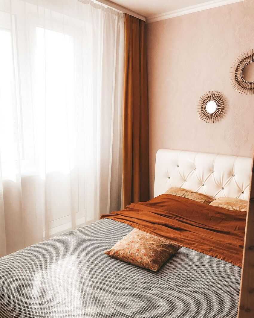 Беж. Это решение позволит выделить элегантность спальни. Беж можно применять для оформления пола с обоями такого же цвета. Его принято объединять с оттенками персика, кофе, малины и фисташки. Чтобы спальня была по максимуму романтичной, нужно не перегружать беж тяжелой кроватью и темным текстилем. Когда задача напротив, сделать необычные акценты на нежном фоне, тогда стоит купить золотистую тюль, оформить декоративный свет и повестить яркие панно.