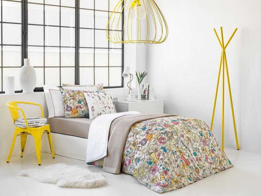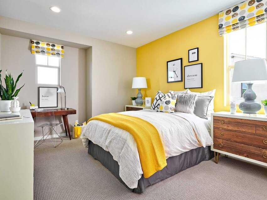 Этот яркий цвет стал использоваться в скандинавских интерьерах из-за нехватки естественного солнечного света. В спальне рекомендуется использовать теплые оттенки типа горчичного, цвета сливочного масла, банановой кожуры, кукурузный, золотистый.