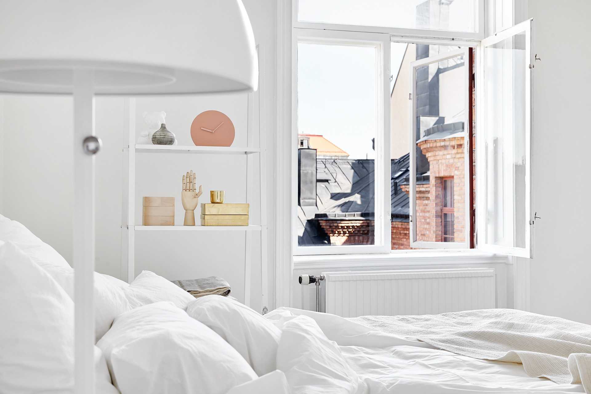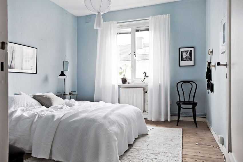 Белый цвет является традиционным для скандинавского интерьера и часто используется как базовый для покраски стен в спальне и отделки других поверхностей.