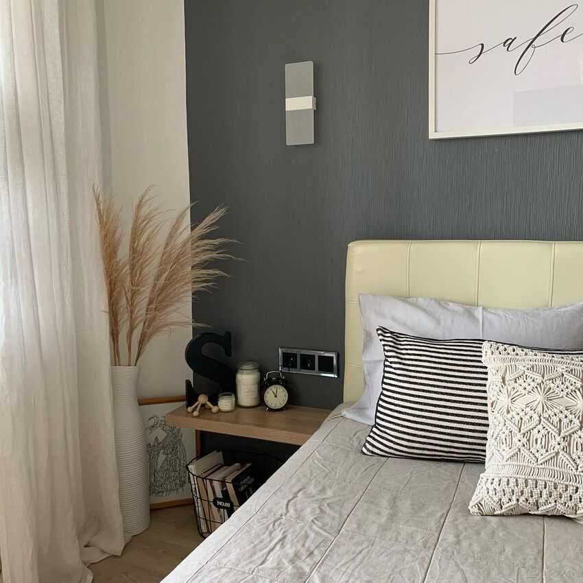 Отличным решением будет создание акцентной стены из ламината. Этот актуальный и модный тренд прекрасно впишется в интерьер спальни.