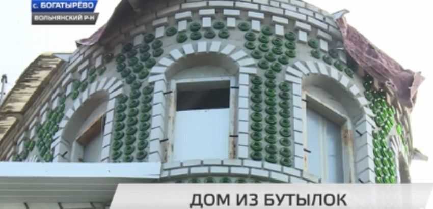 Человек построил целый дом из стеклянных бутылок.