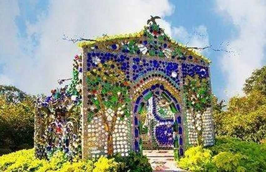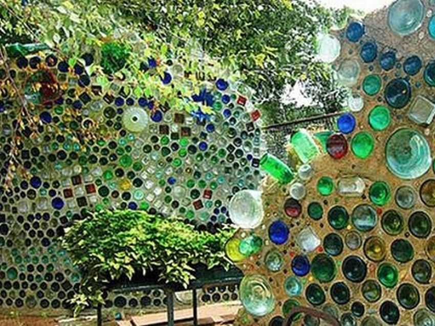 Замечательные постройки сделали в мозаичном стиле из стеклянных бутылок.