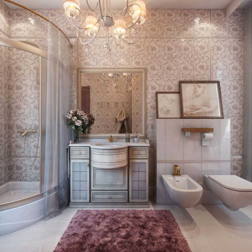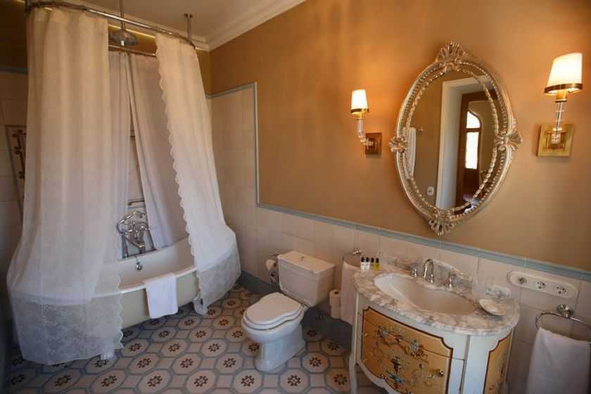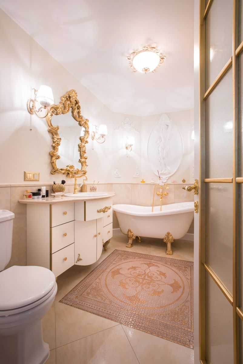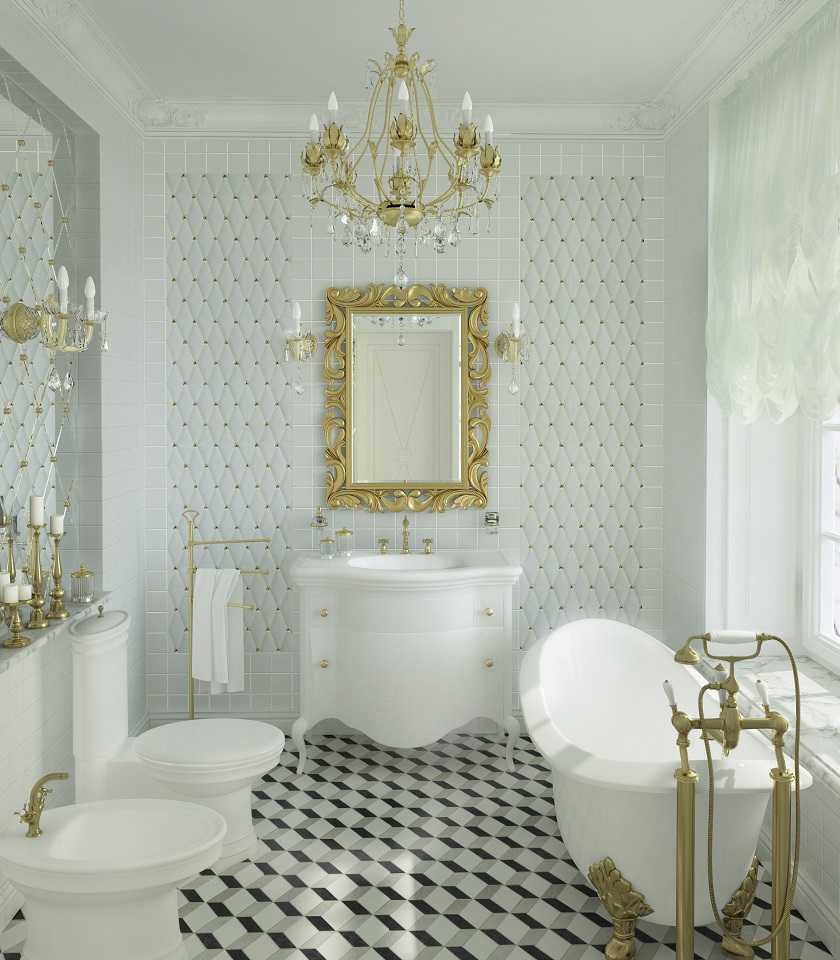 Освещение-бра или люстры из хрусталя. Унитаз, раковина из качественного фарфора или натурального камня.