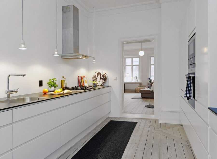 Обратите внимание, чтобы основные зоны не находились на большом расстоянии друг от друга на такой кухня. Помните правило рабочего треугольника. Параллельная кухня