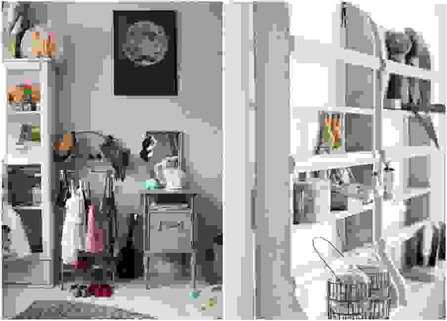 Обрати внимание на открытые модульные стеллажи, в которых можно расставить книги, косметику, вазоны и безделушки