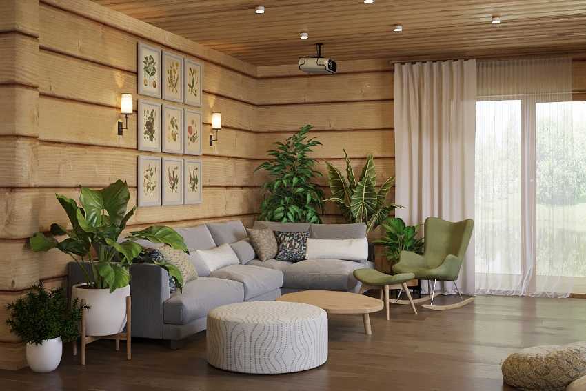 Зеленые комнатные цветы идеально вписываются в интерьер деревянного дома