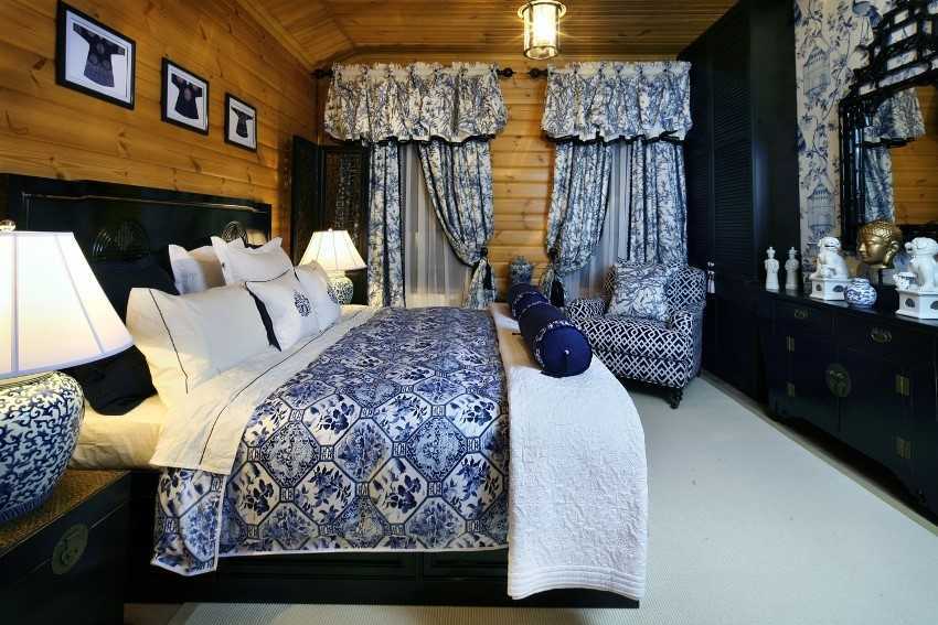 В отличии от гостиной, спальня может быть меньше по площади и иметь уникальный стиль интерьера. Особенно колоритно в деревянном доме смотрится интерьер спальни в стиле кантри. Классический, деревенский, русский и подобные стили тоже будут как нельзя кстати.