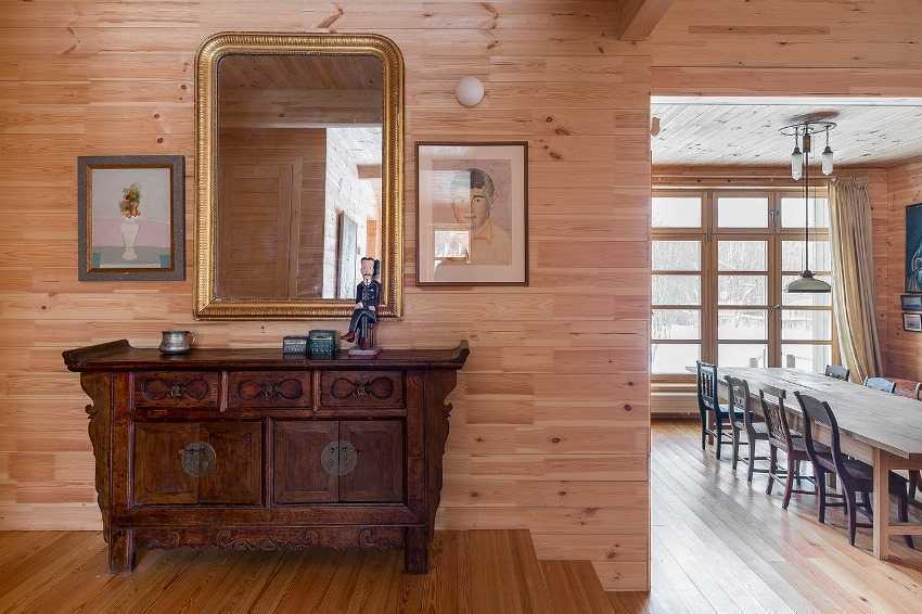 Большие зеркала или панно из зеркальных сегментов способны привнести в обстановку с обилием древесных поверхностей нотки утонченности. Чтобы подчеркнуть просторы загородного интерьера, можно повесить на стену картину – постер или живопись – с габаритами полотна не менее 1,5 м по диагонали.