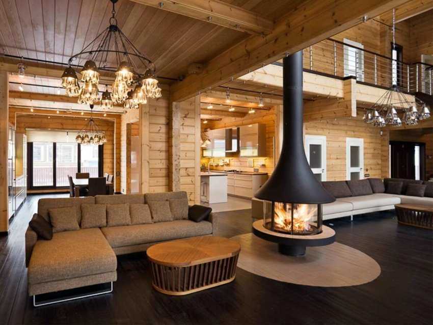 Настоящий или электрический камин – неотъемлемая часть деревянного дома. Он сделает зал уютнее, поможет создать теплую, расслабляющую атмосферу. Камин и поверхность стены вокруг него можно отделать красивой плиткой, мозаикой. Перед камином можно установить красивую декоративную ограду из стали.