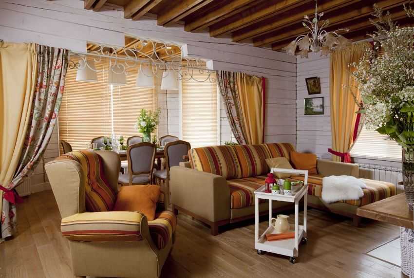 Но большинство интерьеров бревенчатых загородных домов имеют все-таки черты «выделенных» направлений деревенского стиля в отделке: