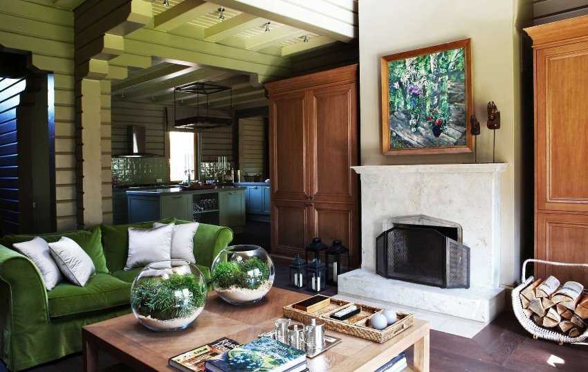 - главным местом притяжения в гостиной станет камин — подойдет как натуральный дровяной, так и электрический или биокамин; вокруг камина сосредоточить остальную мебель — мягкий диван с яркими подушками или кресла с мягкими пледами; хорошо сочетаются с деревом пастельные цвета.