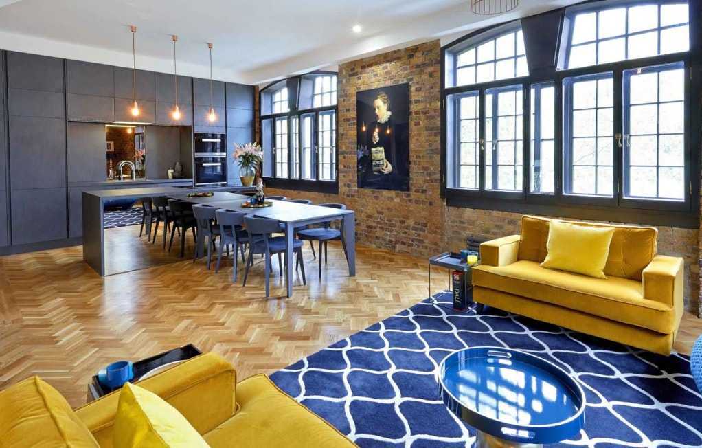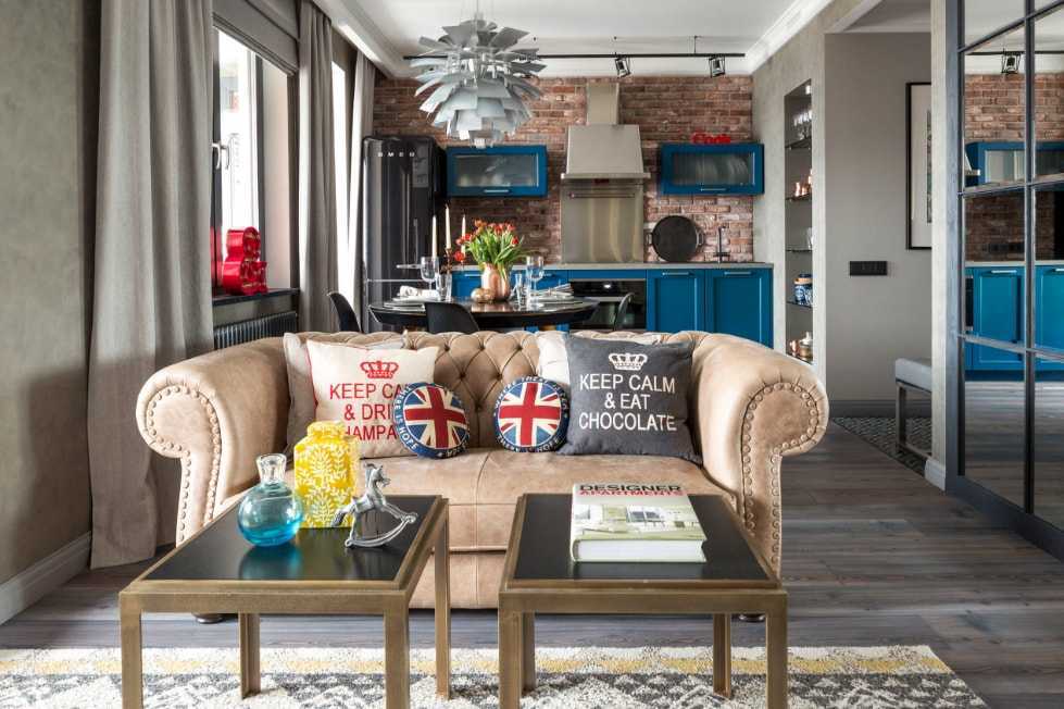 Интерьер столовой-гостиной с элементами лофта в дизайне