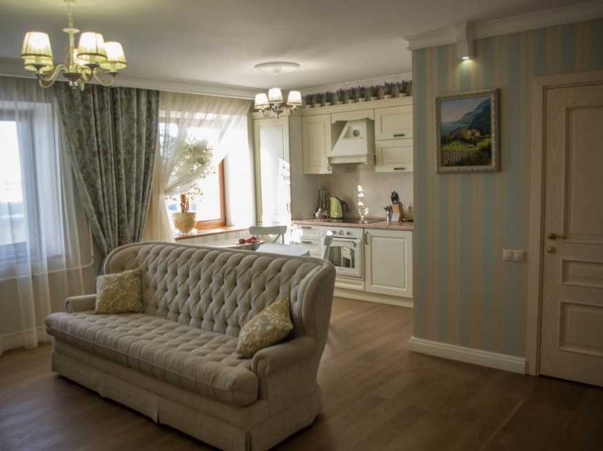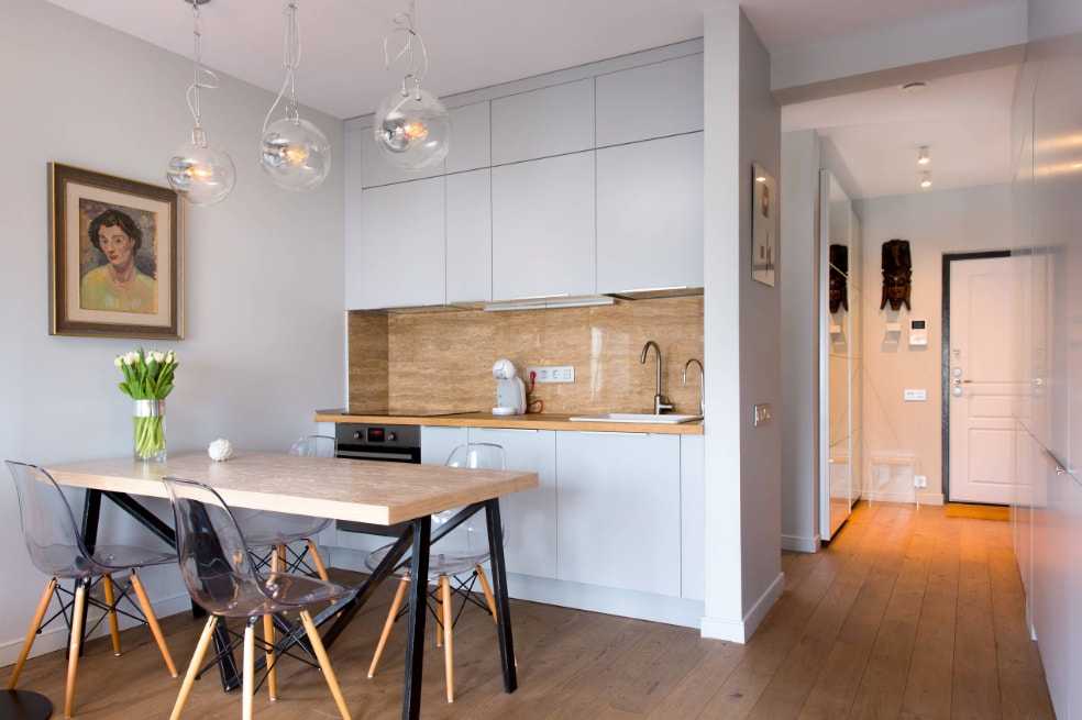 В первую очередь будущее пространство зависит от площади объединяемых комнат. Хотя даже на маленьком пространстве в 15-20 м2 можно уместить кухонный гарнитур, гостиную мебель и декор. Естественно, сюда не получится поместить много мебели, только необходимые предметы.