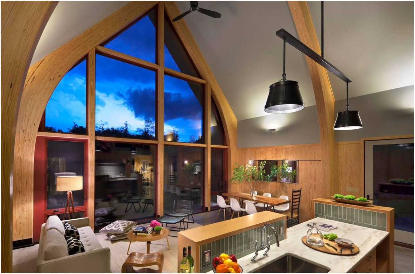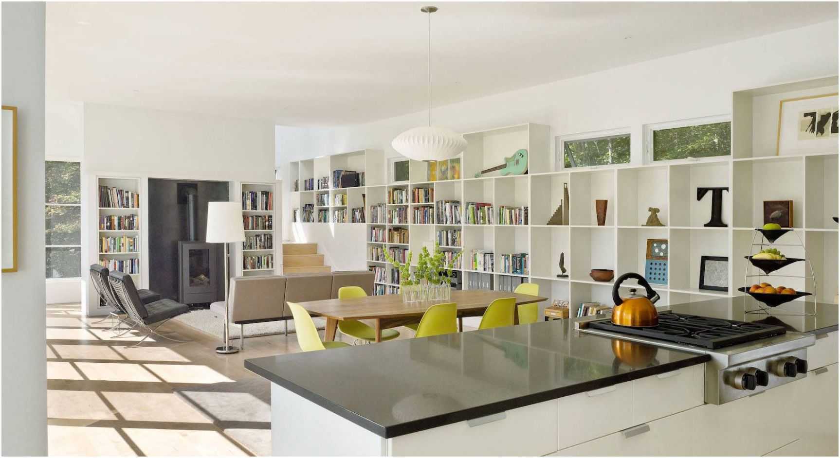 Существует много элегантных и творческих способов разделить или, точнее, создать символическую границу между кухней и жилыми помещениями, фактически не используя разные комнаты со стенами и дверями. Одним из модных подходов в современном дизайне является подъем одной из зон. Другим часто используемым вариантом для разделения между зоной приготовления пищи и гостиной в открытом помещении является стеклянная перегородка — модная и функциональная ловкость, которая дает определенную конфиденциальность между двумя зонами. Шум и запахи из кухни не попадают в гостиную.