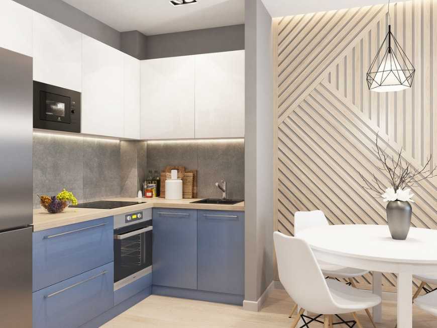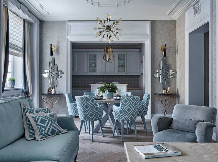 Модным и стильным дизайн может быть не только в светлых оттенках. К примеру, вариант оформления кухни-гостиной в синем цвете выглядит очень красиво. А правильно подобранный цвет стульев и дополнительного освещения делает ее очень гармоничной.