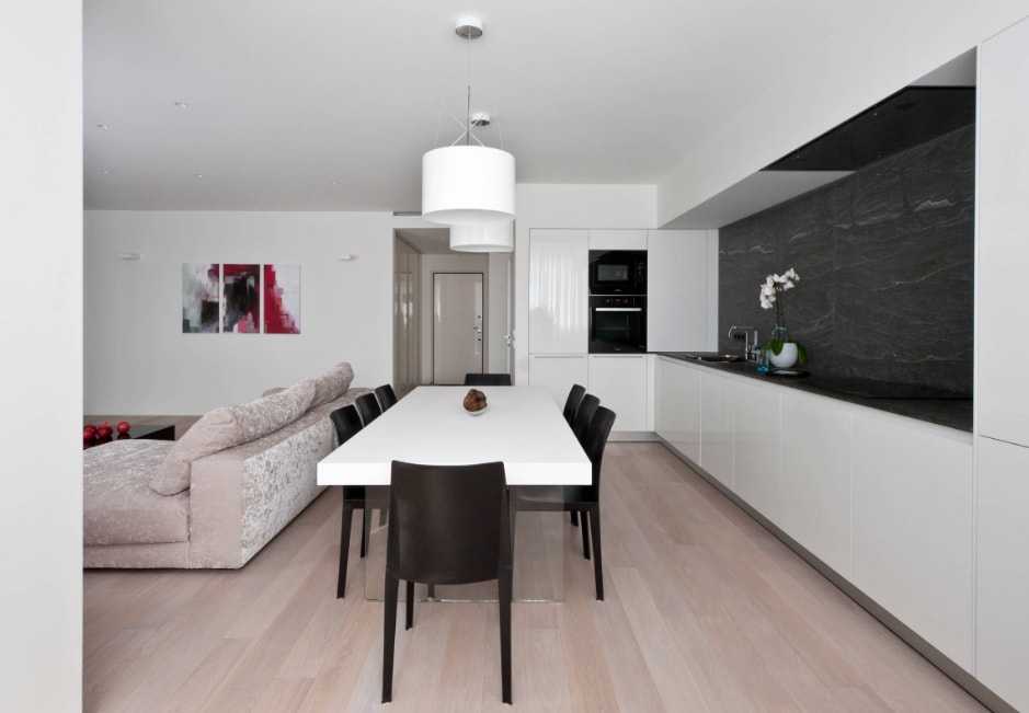 Лаконичный дизайн кухни-гостиной подойдет современным людям, которые любят минимализм во всем.
