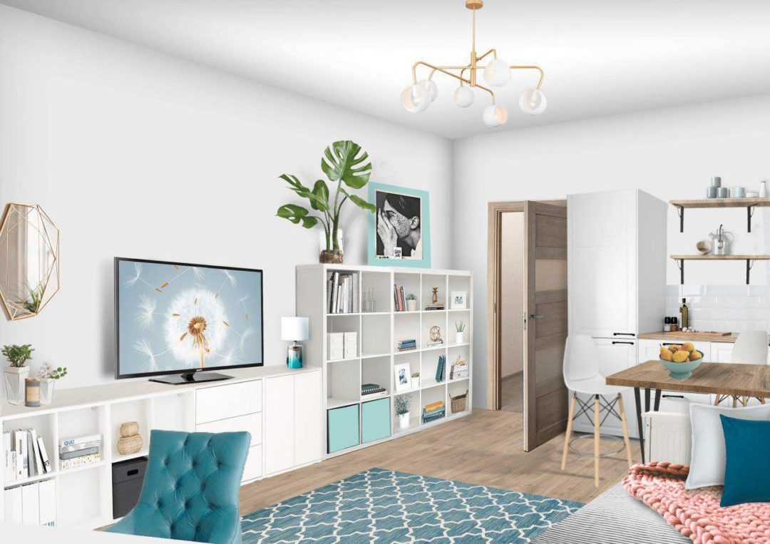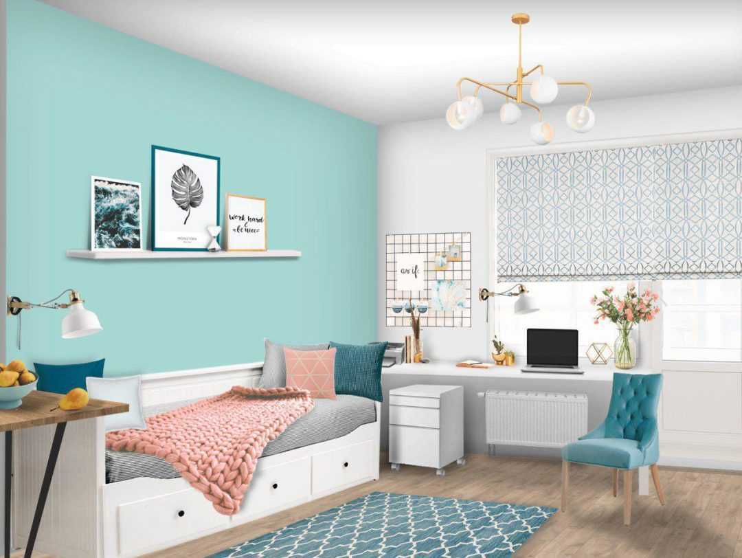 Комментарий дизайнера: «Второй вариант более смелый, я использовала бирюзовый цвет, что бы интерьер выглядел интереснее. Но в нем по прежнему превалируют светлые оттенки, что бы помещение не было мрачным и не теряло легкость. Еще в интерьер были добавлены яркие желтые детали, для того что бы разбавить прохладную гамму и сделать комнату уютнее».