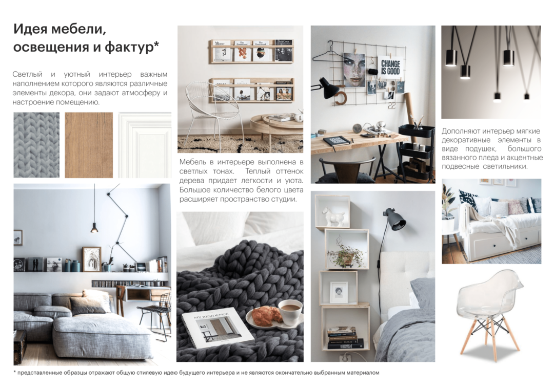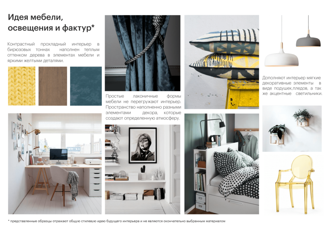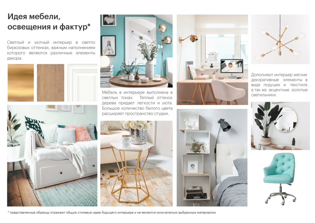 После того как я выслала бриф, прошла тест, ответив на вопросы по тем стилям, которые мне нравятся, Ася прислала мне две идеи, оформленные в виде мудбордов. Моя задача была их оценить и дать комментарии.